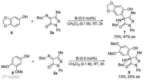 作者随后还对其他富电子酚底物的适用性进行考察,芝麻酚6与3,4-二甲氧基苯酚8参与反应时具有良好的产率,但是产物的对映选择性却较低。