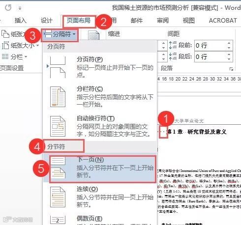 论文分节。单击论文第5 页的最前端,然后单击“页面布局”,在“分隔符”下找到“分节符/下一页”选项,单击“下一页”后,会在光标前面出现一个空白页码,即实现了分节。