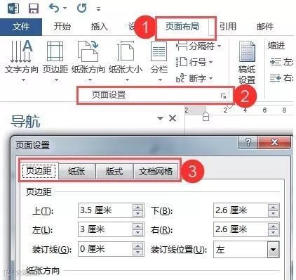 单击“页面布局”后,单击“页面设置”的功能扩展按钮,在弹出的“页面设置”对话框中,逐步设置“页边距”、“纸张”、“版式”等。