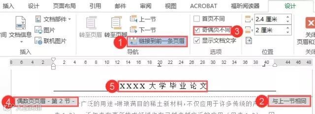 设置偶数页页眉。先单击“链接到前一条页眉”按钮,使页眉右下方的“与上一节相同”消失,然后选择“奇偶页不同”。接下来编辑“偶数页页眉”,在步骤5 中输入所需页眉内容。