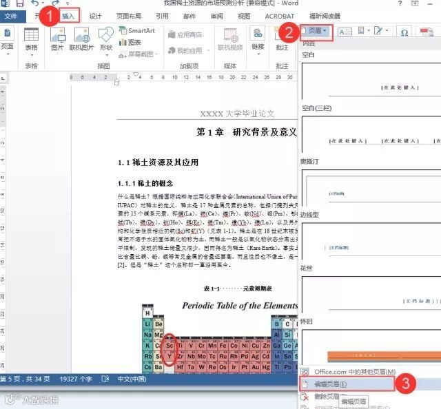 页眉页脚的设置。一般要求毕业论文的奇偶页使用不同的页眉和页脚,如页眉的奇数页为章节的题目,偶数页为论文的题目。以设置页眉为例,在菜单栏中依次单击“插入/ 页眉/ 编辑页眉”。