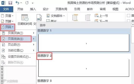 选择页码格式。依次单击“ 页码/页面底端”,然后选择所需数字格式,这里我们选取居中格式的“普通数字2”。
