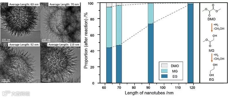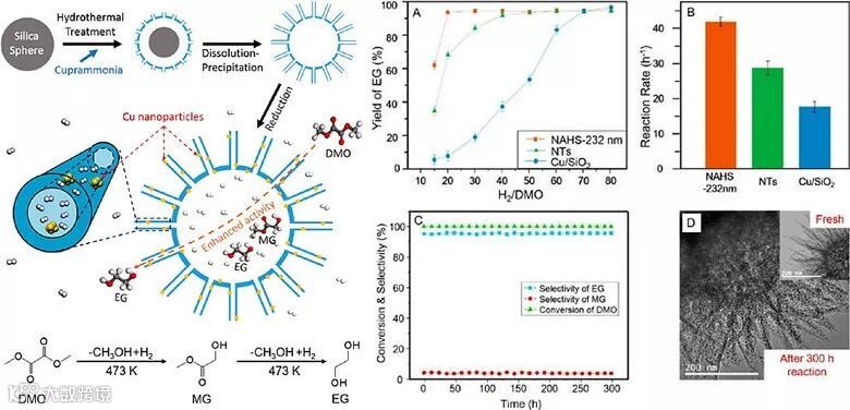 近日,天津大学马新宾课题组制备了形貌可控的硅酸铜球管复合型纳米反应器,解决了加氢反应中氢气占比过大这一问题。他们首先精确合成了具有相同铜分散度和价态分布的球管复合型纳米反应器、纳米管催化剂以及层状结构的催化剂。对比研究发现,球管复合型纳米反应器不仅可以在保持相同催化活性的前提下将氢酯比从原来所需的80降为20,而且也可以保持良好的稳定性。通过氢气高压吸附实验和蒙特卡洛动力学模拟计算发现,由于空心球和纳米管内壁的曲面效应,氢气分子可以在空心球和纳米管内部富集。此富集效应增大了氢气在活性位周围的浓度,提高了反应活性,起到了降低氢酯比的作用。另一方面,该课题组发现,通过控制空心球上组装纳米管的长度,可以有效调控纳米管中草酸酯和铜活性位的接触时间,从而起到选控合成乙二醇和乙醇酸酯的作用。这种反应物在纳米管中的限域效应为催化过程中调控反应产物分布的方式提供了新的研究思路。该工作揭示了催化剂空腔结构对反应物的富集效应和限域效应对于催化反应中的影响,为催化剂的理性设计提供了新思路。