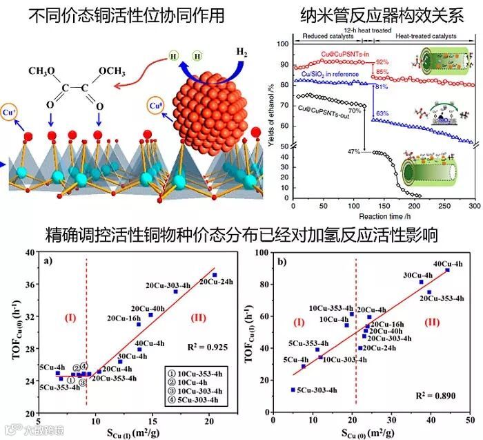 天津大学马新宾课题组长期致力于合成气制乙二醇/乙醇工艺路线开发,本次工作是基于该课题组铜基催化剂机理和构效关系等一系列研究完成的。由于铜基催化剂表面铜物种分散度和价态分布是影响加氢反应活性的主要因素,他们利用蒸氨法制备了含有氧化铜纳米颗粒的层状硅酸铜前驱体,在还原过程中层状结构对氧化铜纳米颗粒起到了限域作用,使还原后生成的Cu0高度分散在二氧化硅载体表面;而金属-载体间存在的强相互作用使硅酸铜还原后生成的Cu+可以在反应条件下稳定存在。在同一工作中,他们首次发现了仅通过调变草酸酯加氢反应温度选控合成乙二醇和乙醇的工艺路线(JACS, 2012, 134, 13922)。在此基础上,课题组通过精确调控催化剂表面结构与铜物种价态分布,进一步证明了不同价态铜物种间的协同催化作用,即Cu0促进氢气解离,Cu+有利于酯类分子中甲氧基或酰基的吸附活化(ACS Catal., 2015, 5, 6200, 点击阅读详细)。此外,该课题组利用硅酸铜纳米管的限域效应限制纳米管内部铜颗粒的聚集长大,使其在更剧烈的热冲击处理条件下也能保持良好的催化活性和稳定性(Nat. Commun., 2013, 4, 2339)。在此工作中也发现了纳米管内部的反应速率明显高于纳米管外部,为本次工作提供了研究基础。同时,该课题组在加氢反应中整体形催化剂设计、助剂改性及反应动力学机理研究等方面做了相关研究,获得了一系列进展(J. Catal., 2013, 297, 142; AIChE J., 2012, 58, 2798-2809; AIChE J., 2013, 59, 2530; Ind. Eng. Chem. Res., 2015, 54, 1243)。