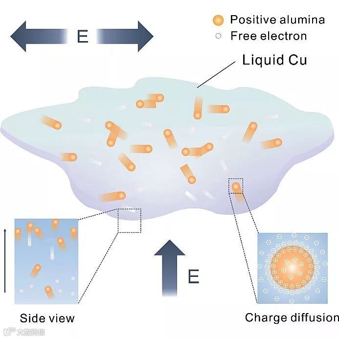 武汉大学付磊教授的先进纳米材料实验室(LAN)率先在这一领域取得了突破,他们首次实现了金属氧化物纳米粒子在液态金属表面的自组装。他们选用的研究对象是含有氧化铝纳米粒子的工业铜,当铜在高温下处于融化状态时,液态铜与氧化铝相互接触,由于二者功函差异电子会从氧化铝流向铜直至费米能级达到平衡。液态铜的流动性使得带电氧化铝纳米粒子可以在液态铜中自由移动,粒子与粒子间的静电斥力促使它们能组装为有序的阵列结构(图1),而且其尺寸可覆盖整个基底表面。