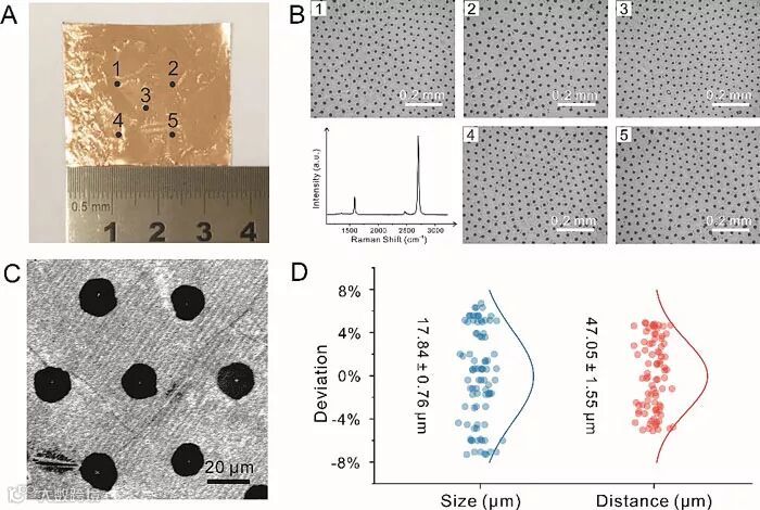 考虑到氧化铝纳米粒子可以极大降低晶体的成核能垒,研究团队将所获得的氧化铝纳米粒子阵列作为成核点,以化学气相沉积(CVD)方法生长石墨烯单晶,实现了石墨烯的大范围精确“播种”,得到了大面积的石墨烯单晶阵列(图2)。扫描电镜(SEM)结果表明,即使在如此大面积的阵列中,石墨烯单晶依然分布均匀,排列近似六边形,而且尺寸均一,表现出了很好的周期性。从放大的SEM图像中,还能清晰的看到位于石墨烯晶体中心的氧化铝纳米粒子(图2C)。