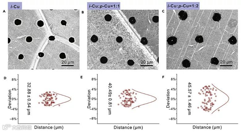 基于这种策略得到的石墨烯单晶阵列,其周期性与氧化铝纳米粒子阵列几乎完全一致,因此改变氧化铝纳米粒子阵列的周期性就能够调控石墨烯单晶阵列的周期性。研究团队通过高纯度铜(p-Cu)与工业铜(i-Cu)共同融化来降低氧化铝纳米粒子的密度,以实现对石墨烯单晶阵列周期性的调控。SEM图像显示,不同氧化铝纳米粒子密度下,石墨烯单晶阵列的周期性的确产生了受控的变化(图3)。