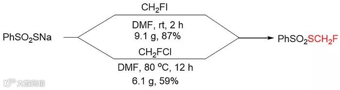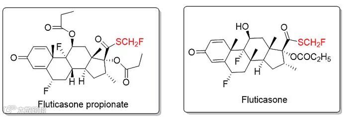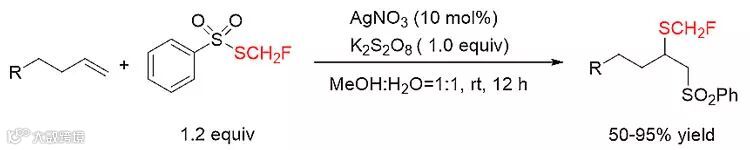 氟烷硫基作为重要的含氟基团,在农药和医药分子中有着重要的应用。近年来,人们发展了一系列向分子中引入三氟甲硫基(SCF3)二氟甲硫基(SCF2H)以及二氟烷硫基(SCF2R)的方法。但是,另一个重要的含氟基团——一氟甲硫基(SCH2F)的引入方法报道相对较少,直接引入方法还没有被报道。下图列举了两个含一氟甲硫基的药物分子,左边是糖皮质激素类药物丙酸氟替卡松,具有强效的局部抗炎与抗过敏作用,用于预防和治疗季节性过敏性鼻炎和常年性过敏性鼻炎;右边的是治疗哮喘的特效药辅舒酮。因此,发展直接引入一氟甲硫基的方法有着重要的意义。