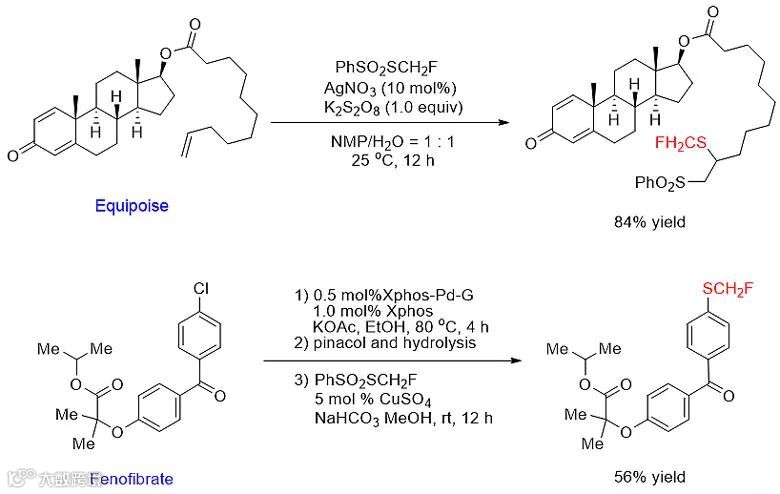 为了证实反应的实用性,作者对一些天然产物以及药物分子进行了一氟甲硫基化修饰。对于未活化烯烃的双官能团化反应,作者选取了天然产物宝丹酮十一碳烯酯作为底物,发现在标准条件下,反应可以顺利发生,以84%的分离收率得到一氟甲硫基、砜基双官能团化产物;对于和芳基硼酸的偶联反应,作者选取了药物分子非诺贝特,这是一个降低胆固醇的药物。通过钯催将C-Cl键转化为硼酸,再把催化剂的量提高到10 mol%,可以以 56% 的收率得到一氟甲硫基修饰的非诺贝特分子。