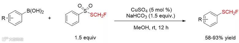 在成功实现未活化烯烃的双官能团化反应后,作者希望进一步向芳环中引入一氟甲硫基。通过反应尝试和条件筛选,发现以5 mol% 硫酸铜作为催化剂,1.5 当量碳酸氢钠作为碱,甲醇作为溶剂,室温反应12 h 便能成功实现和芳基硼酸的偶联反应。该反应条件温和,底物适用性广。