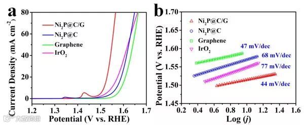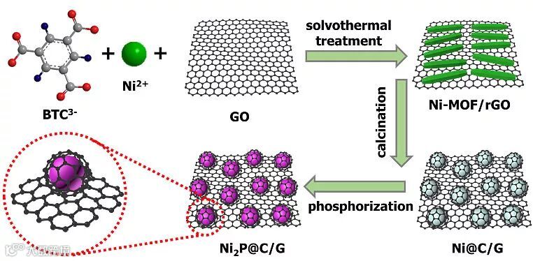 析氧反应(oxygen evolution reaction,OER)是水分解、可充放金属空气电池等相关能源领域研究中重要的半反应。然而OER缓慢的动力学和过高的过电势,制约了其在实际生产过程中的广泛应用。目前商用的Ru、Ir等贵金属基催化剂(如RuO2 和IrO2 等),存在着成本高、反应过程易氧化失活等缺点。因此,研究低成本、高活性、高稳定性的非贵金属基OER催化剂具有十分重要的意义。近日,武汉理工大学的麦立强教授、周亮教授研究团队成功制备出了具有较高OER催化活性的金属有机框架结构(MOF)衍生的金属磷化物/石墨烯复合材料。