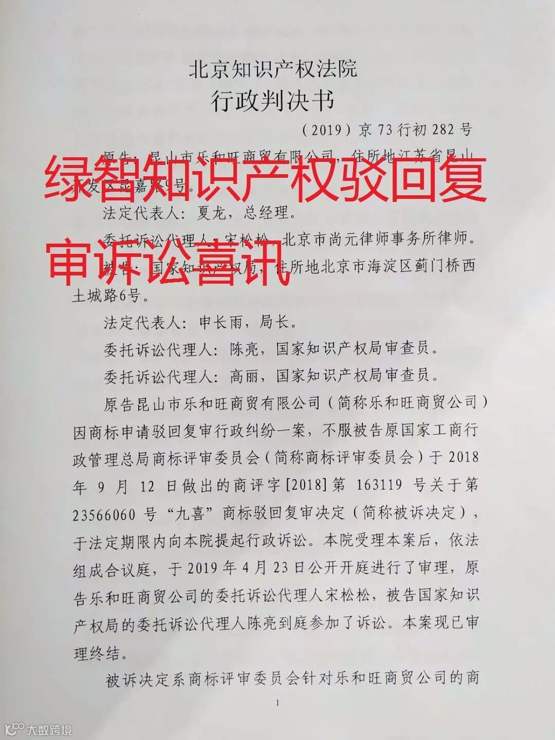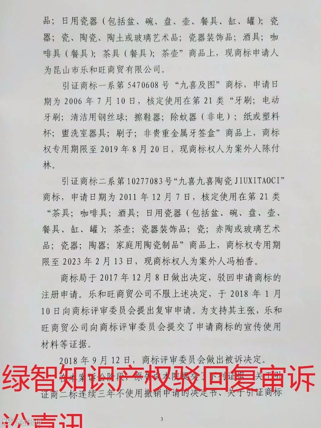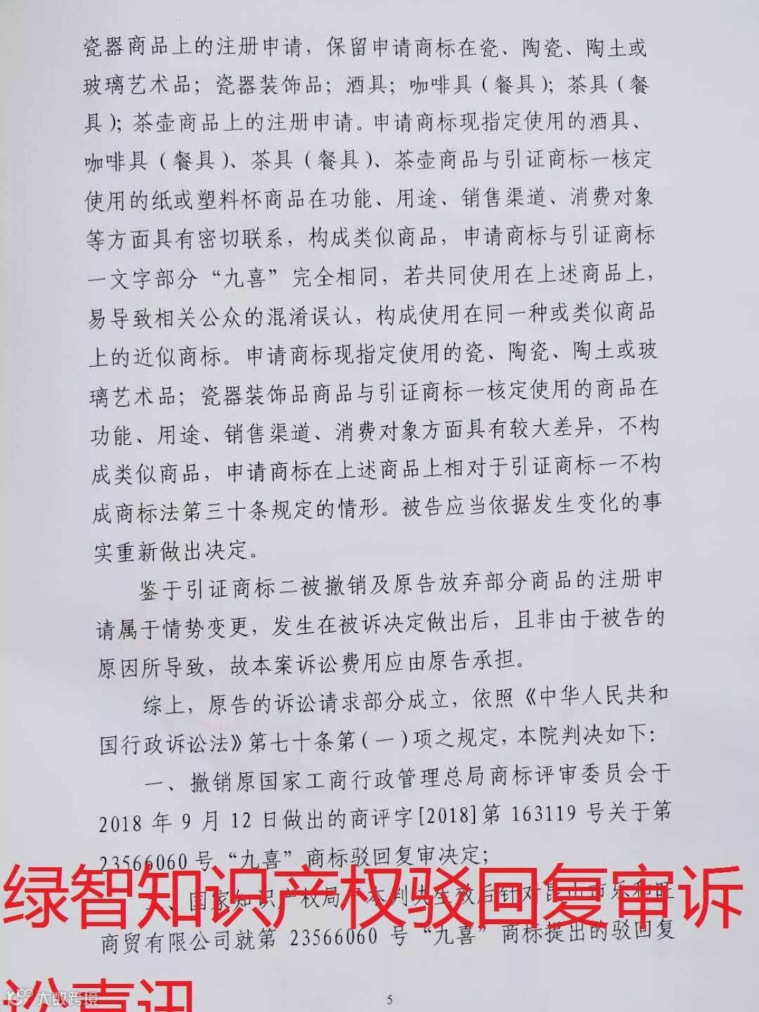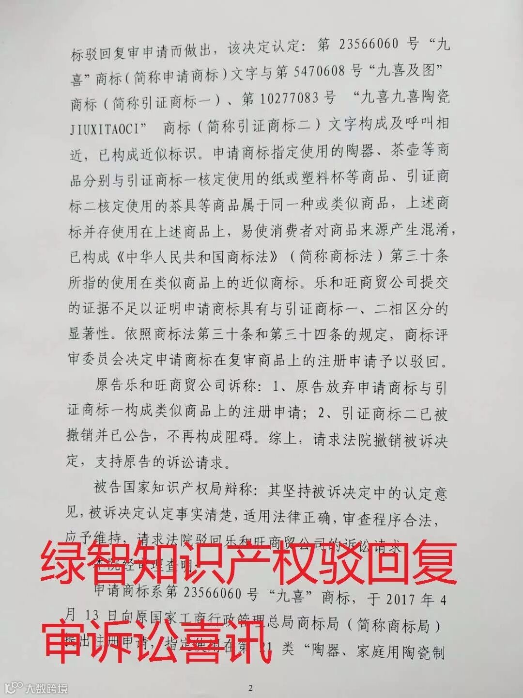 看绿智如何为“九喜”商标打赢驳回复审诉讼案