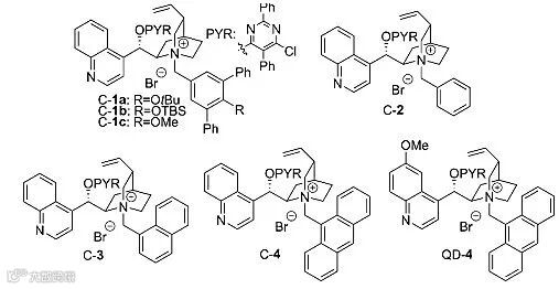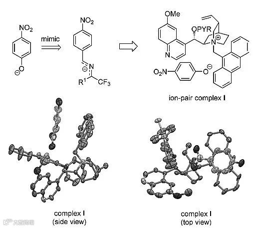 为了证实奎尼丁催化剂与2-氮杂烯丙基阴离子2之间存在π–π相互作用,作者使用对硝基苯氧负离子取代催化剂QD-4的溴离子,该物种可用于模拟不稳定的2-氮杂烯丙基阴离子2,X射线单晶衍射分析结果显示,催化剂中的蒽环和4-硝基苯酚存在π–π相互作用,由此也成为催化剂设计的关键所在(图8)。