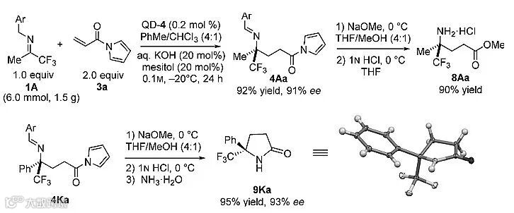 为了证明该催化体系的实用性,作者设计了底物1A和3a克量级规模的制备过程,产物4Aa的产率和对映选择性都得到了很好的保持,经过简单的酯化和保护基消除两步反应,以90%的总收率得到了氨基酸酯8Aa。产物4Ka经过简单的酯化、保护基水解和环化三步反应,以95%的总收率得到手性吡咯烷酮衍生物9Ka,该化合物通过X射线单晶衍射分析确定了其相对和绝对构型(图7)。