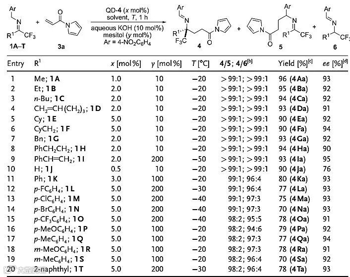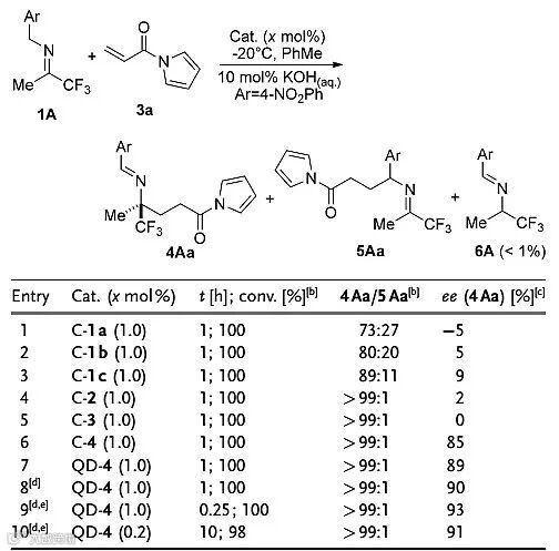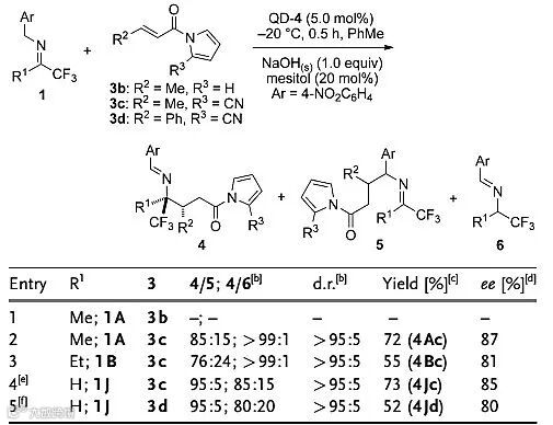 作者首先选择三氟甲基亚胺1A和不饱和酰基吡咯3a作为模板底物,对一系列催化剂进行筛选。催化剂C-1a、C-1b和C-1c虽然呈现出良好的转化活性,但是反应体系有大量的区域异构体5Aa形成,产物4Aa的对映选择性也很差。随后筛选得到的C-2和C-3催化剂虽然能有效控制产物的区域选择性,但是产物的对映选择性依然不理想。而当使用C-4作为催化剂时,反应不仅区域选择性能得到很好的保持,产物的对映选择性也可达到85%。而当催化剂的骨架结构换作奎尼丁,即催化剂QD-4时,产物的对映选择性提高到89%。作者随后筛选了不同种类的溶剂和添加剂,最终发现使用PhMe/CHCl3作为混合溶剂,2,4,6-三甲基酚作为添加剂时,反应时间不仅缩短,产物的对映选择性也提高到93%(图3、图4)。