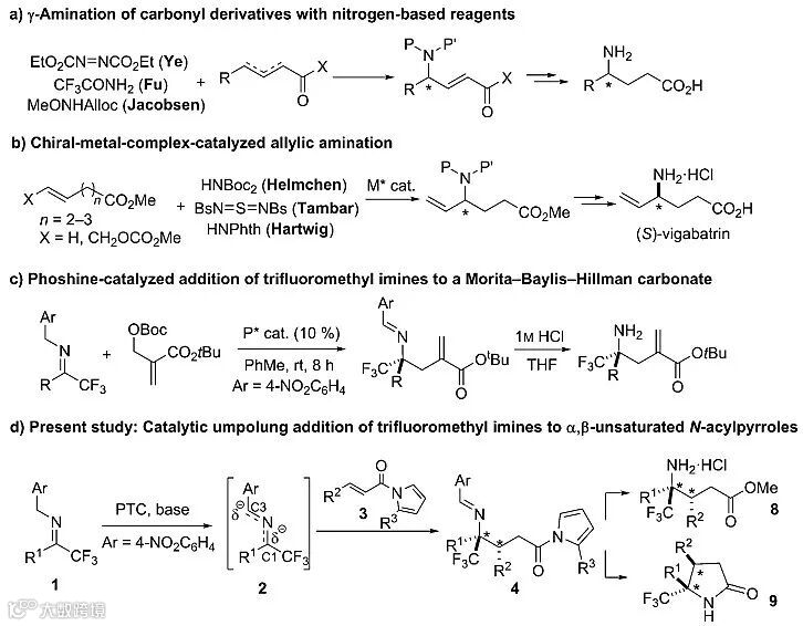 最近,美国布兰迪斯大学的Li Deng教授团队设计了一种新型的金鸡纳碱催化剂,实现了相转移催化三氟甲基亚胺对α,β-不饱和酰基吡咯的不对称极性反转加成反应,由此提供了一种构建手性三氟甲基化γ-氨基酸衍生物的实用方法(图2)。相关成果发表在Angew. Chem. Int. Ed. 上,第一作者为Bin Hu。