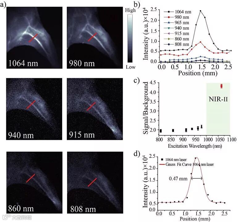 图3. 不同激发波长对小鼠左下肢成像图。(a) 不同激发波长对小鼠左下肢成像图;(b) 不同激发波长下的荧光强度随红线距离的变化图;(c) 不同激发波长下对应的信噪比示意图;(d) 1064 nm激发下对应小鼠左下肢血管半宽峰示意图。图片来源:Angew. Chem. Int. Ed.