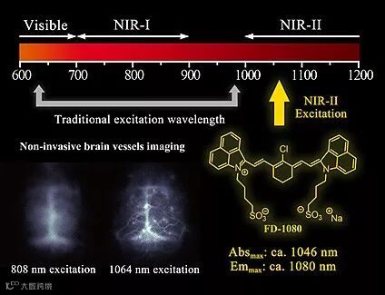 最近,复旦大学化学系张凡教授团队,以1,8-萘内酰亚胺等为原料,通过四步反应可高收率(60%)合成了具有NIR-II激发和发射的有机小分子七甲川菁荧光染料FD-1080。在加热条件下,此小分子易于进入胎牛血清(FBS)的疏水空腔内形成复合物,引起染料单体比例增多同时分子刚性结构增大,使其荧光量子产率得到大幅提高(5.94%)。该复合物具有激发波长位于1064 nm和荧光发射波长位于1080 nm的特性。同时,本文证明了相对于已报道的NIR-II材料所使用的激发波长(650-980 nm),1064 nm作为激发波长具有更好的组织穿透深度和空间分辨率。该复合物不仅能实现小鼠下肢及脑部血管高分辨成像,而且能够动态监测清醒及麻醉状态下的小鼠呼吸情况。