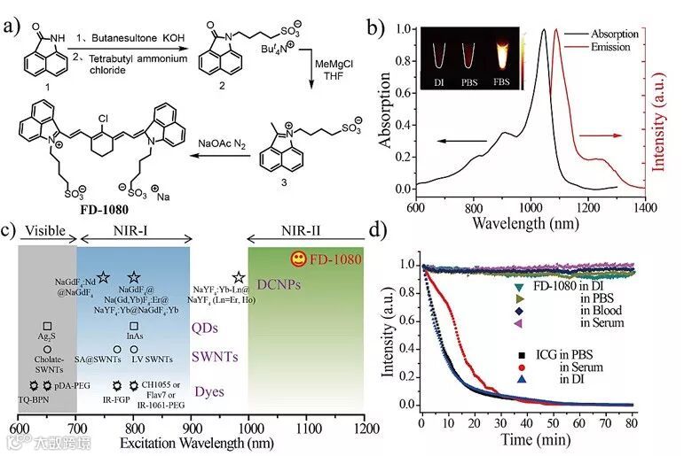 图2. FD-1080的表征及NIR-II材料的激发波长统计图。(a) FD-1080合成路线示意图;(b) FD-1080的吸收及荧光光谱图;(c) 已报道NIR-II材料的激发波长统计图;(d) FD-1080光稳定示意图。图片来源:Angew. Chem. Int. Ed.