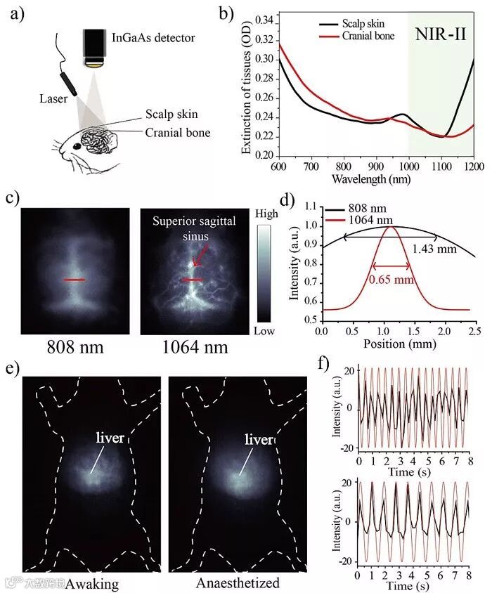 图4. 不同激发波长下小鼠脑部及呼吸频率示意图。(a) 小鼠脑部血管成像示意图;(b) 小鼠头皮及头盖骨的消光曲线图;(c) 1064 nm及808 nm激发下脑部血管成像图;(d) 1064 nm及808 nm激发下对应脑部血管半宽峰示意图;(e) 1064 nm激发下小鼠清醒及麻醉状况下肝脏成像图;(f) 小鼠清醒及麻醉状况下呼吸速率测定图。图片来源:Angew. Chem. Int. Ed.