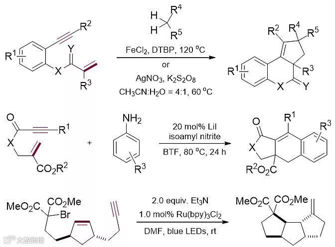 图2. 1,n-烯炔作为受体参与的自由基串联环化反应的代表性实例