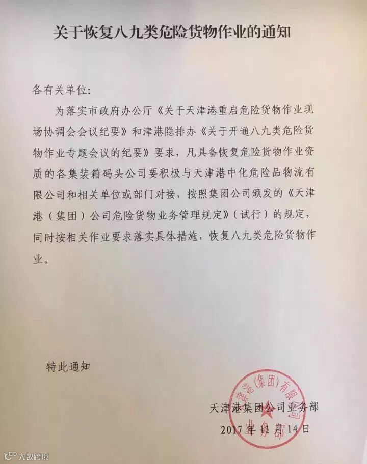 为落实市政府办公厅《关于天津港重启危险货物作业现场协调会会议纪要》和津港隐排办《关于开通八九类危险货物作业专题会议的纪要》要求,凡具备恢复危险货物作业资质的各集装箱码头公司要积极与天津港中化危险品物流有限公司和相关单位或部门对接,按照集团公司颁发的《天津港(集团)公司危险货物业务管理规定》(试行)的规定,同时按相关作业要求落实具体措施,恢复八九类危险货物作业。