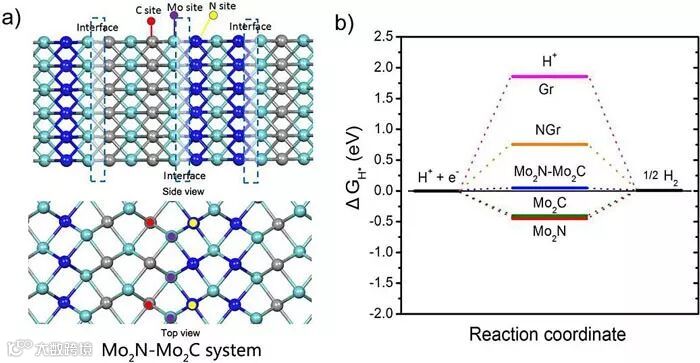 作者还利用密度泛函理论计算揭示了该催化剂具有优异的析氢电催化性能以及催化活性位点。理论计算结果表明,位于Mo2N-Mo2C界面处的N-Mo-C是主要的催化活性中心,而多孔还原氧化石墨烯载体在传质和传荷方面扮演着重要的作用。这一研究成果发表在Advanced Materials 上。