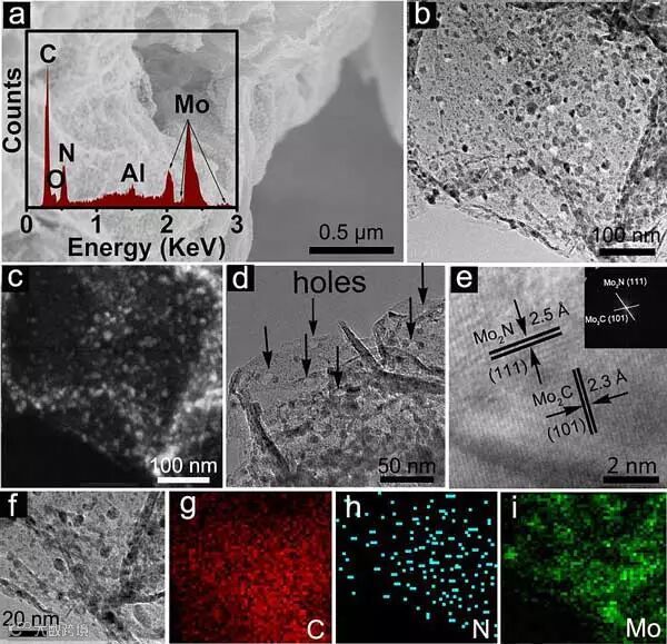图1. Mo2N-Mo2C/HGr催化剂的SEM和TEM表征