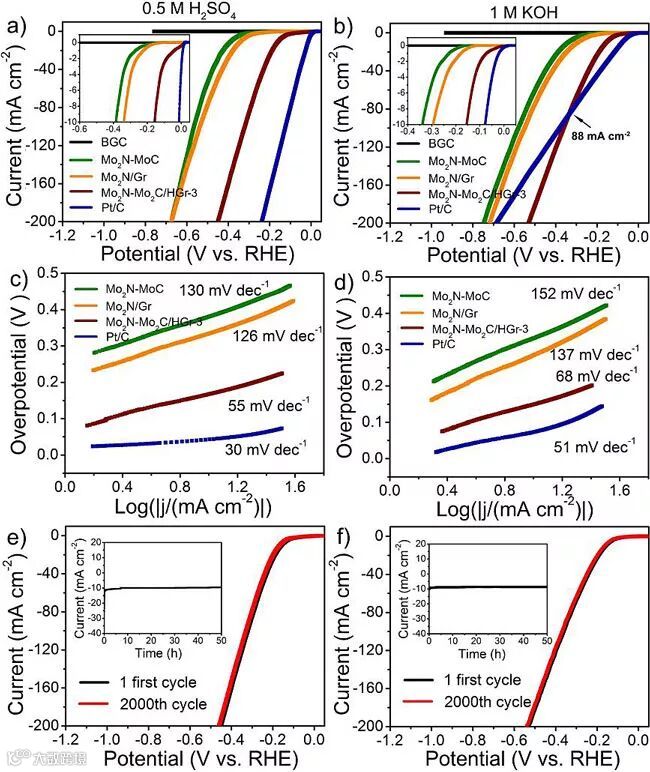 图2. Mo2N-Mo2C/HGr催化剂的HER活性