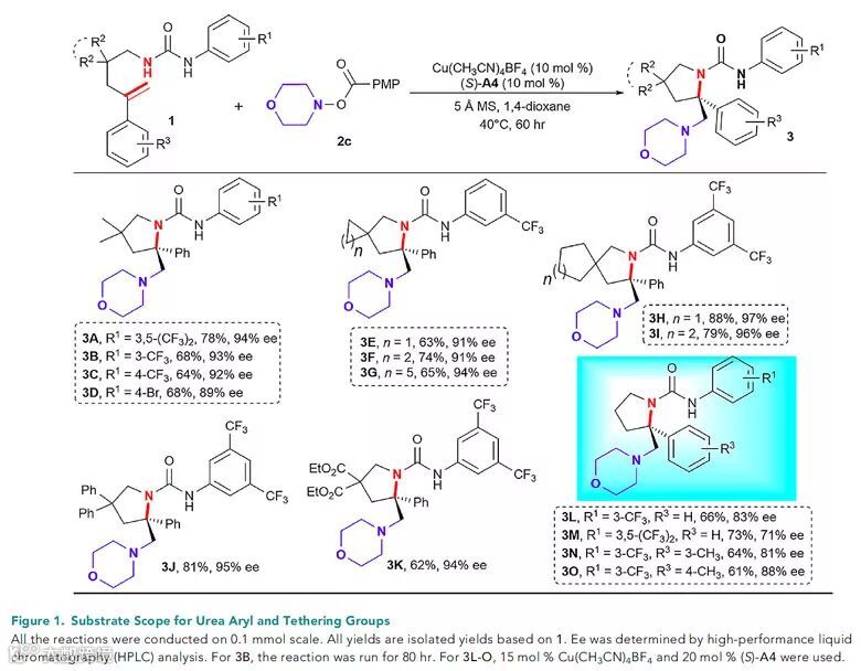 在最佳反应条件下,他们考察了N-烯基脲的底物适用范围,发现该反应具有非常好的底物适用性。首先,具有不同缺电子取代基的芳基脲底物3A–3D都适用于该反应;骨架中含三元至七元环以及二苯基和二酯基等官能团的底物均可以较好的收率和对映选择性得到目标产物3E–3K;更为重要的是,脂肪链底物1l–1o在提高催化剂用量的条件下也可以顺利地参与反应。