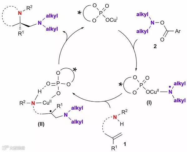 根据该课题组发展的新型Cu(I)/手性磷酸组成的金属手性阴离子单电子催化体系,作者提出了合理的反应机理。该方法利用羟胺酯类化合物2作为氮自由基前体,在Cu(I)的作用下,通过单电子转移产生Cu(II)稳定的二烷基胺基自由基I,随后和底物烯烃1发生加成反应,生成中间体II。手性磷酸通过氢键和配位键或者离子键与底物和Cu作用,进而控制新产生的碳自由基与Cu(II)结合的立体选择性,最后通过还原消除反应形成双胺化产物。该方法的亮点在于羟胺酯类化合物2既作为氧化剂,又作为胺源,从而避免使用大量的额外氧化剂,同时还解决了可能存在催化剂毒化的问题。