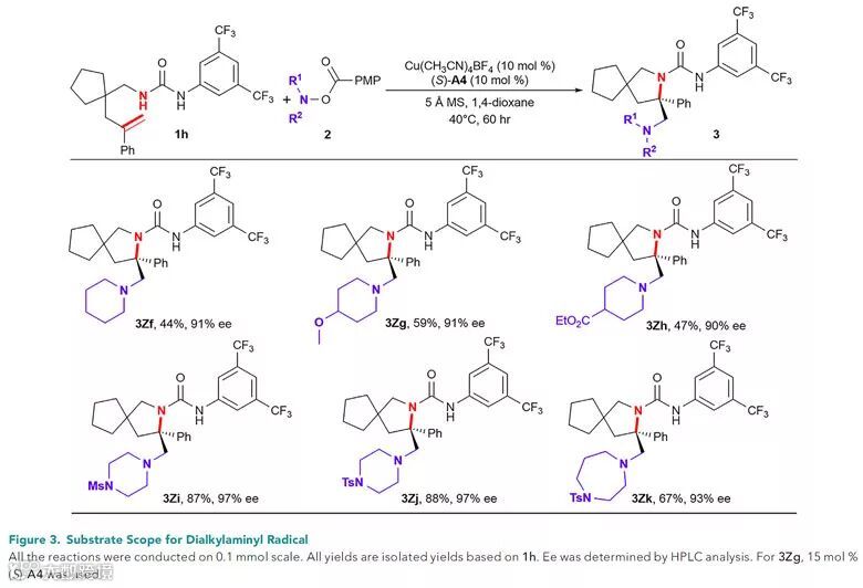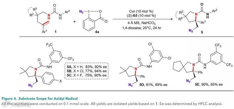 考虑到叠氮化合物作为胺的一类重要前体,作者还尝试利用叠氮自由基进行叠氮胺化反应。通过一系列条件优化,他们发现以10 mol%的CuI和10 mol%的CPA (S)-A5作为催化剂,以1,4-二氧六环作为溶剂,以4 Å分子筛和碳酸氢钠作为添加剂,反应在室温条件下能以较高的收率和对映选择性得到目标产物。