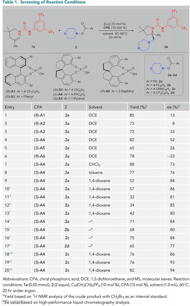作者首先以底物1a作为模板底物,以羟胺酯类化合物2a作为氮自由基前体进行条件筛选,在二氯乙烷(DCE)溶剂中以10 mol%的Cu(CH3CN)4PF6 和15 mol%的手性磷酸分子CPA作为催化剂,60 ℃条件下反应20小时。作者对不同骨架结构与取代基的手性磷酸催化剂进行了考察,发现CPA (S)-A4可以取得较好的反应结果,以82%的收率及52%的对映选择性得到目标产物3A。随后,作者通过筛选得到最优的铜催化剂Cu(CH3CN)4BF4和溶剂1,4-二氧六环并继续对氮自由基前体化合物2a–2d中苯环的电性进行调节,发现苯基对位具有OMe给电子基团的化合物2c能得到更好的结果。作者进一步调节添加剂、反应温度和催化剂的用量,最终得到最佳的反应条件:以10 mol%的Cu(CH3CN)4BF4和10 mol%的(S)-A4作为催化剂,1,4-二氧六环作为溶剂,活化的5 Å分子筛作为添加剂,40 ℃条件下反应60小时,以82%的收率、94%的对映选择性得到双胺化产物3A。