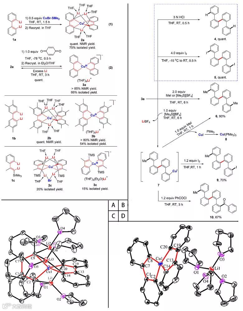 北京大学的席振峰-张文雄研究团队一直致力于含有1,3-丁二烯骨架有机铜化合物的合成、结构表征和反应化学的研究。四烷基取代的双锂试剂和过量的CuCl在Et2O或THF中反应能生成一系列多核的有机铜簇合物(J. Am. Chem. Soc., 2014, 136, 610)。此外,α-三甲基硅基取代的双锂试剂和0.5当量的氮或膦配体配位的CuCl在Et2O/正己烷混合溶剂中反应,能生成具有芳香性的二铜杂[10]轮烯化合物(J. Am. Chem. Soc., 2016, 138, 60; 点击阅读详细)。