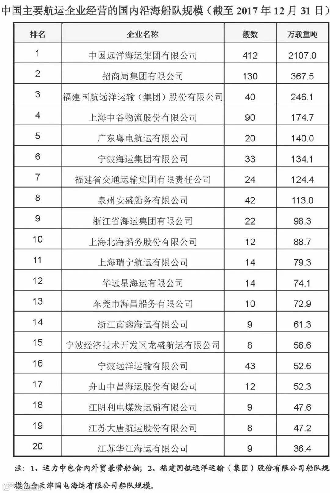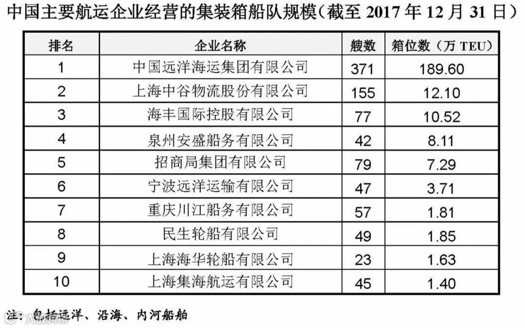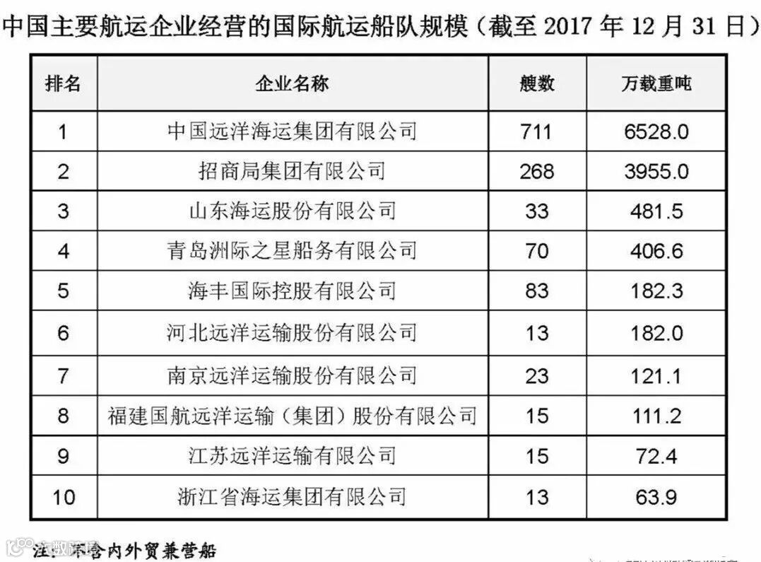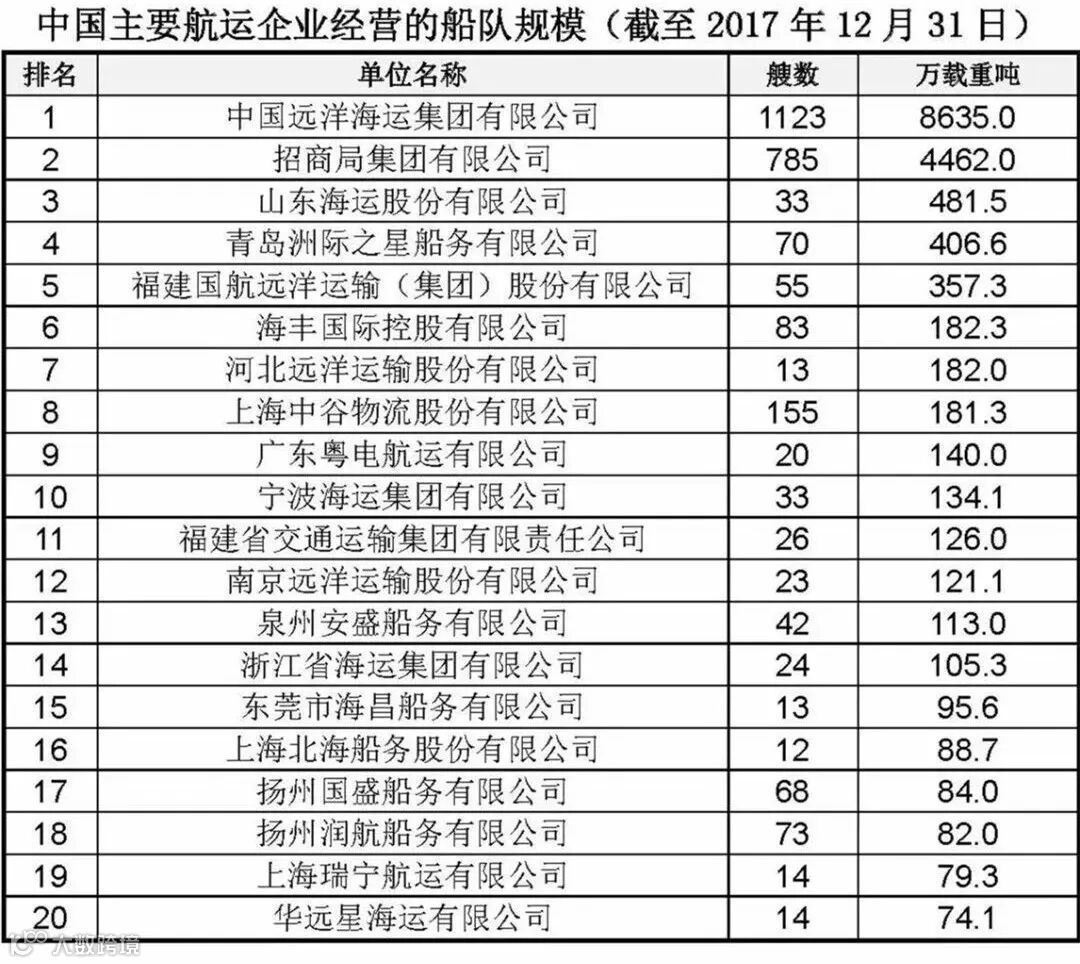 《2017年中国航运发展报告》发布2017年中国主要航运企业船舶运力总体情况,现将我国航运企业船舶运力排名予以公示。