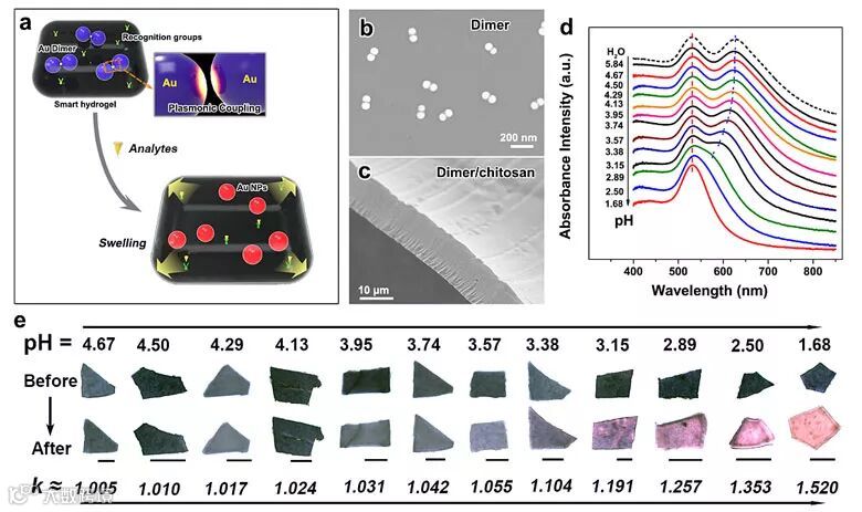 针对这一问题,中科院固体物理研究所的李越研究员课题组与中国科学技术大学、济南大学等单位合作,在前期成功获得尺寸均一单分散Au纳米球的基础上,采用银离子诱导组装的方法,获得大批量、高质量的Au纳米球二聚体,提出将Au二聚体与智能水凝胶相复合的新思路,利用Au二聚体的光学高敏感、可调谐间隙依赖的特性,开发了一种新型的基于Au二聚体的高敏感、高稳定性且动态可调灵敏度范围的比色传感器件。该传感器巧妙利用水凝胶受到外界物质刺激引起体积迅速膨胀或收缩的特点,成功实现了对Au纳米球二聚体中光学性质的动力学精确调控,进而实现了高敏感比色传感器件的构筑(如上图所示)。此外,他们将Au二聚体嵌入水凝胶薄膜中,可有效克服其自发团聚与沉降等不足,具有很好的稳定性。该团队进一步合理利用水凝胶的膨胀程度反比于其交联度的敏感特性,大大拓宽了器件灵敏度的动态可调谐范围,实现了不同浓度范围内目标分析物的敏感探测。