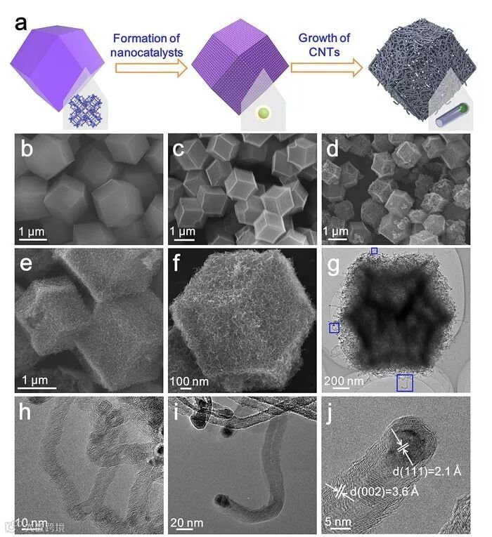 图1. 基于类沸石咪唑酸酯(ZIF-67)定向形成的氮掺杂碳纳米管组装的中空十二面体的合成和表征。