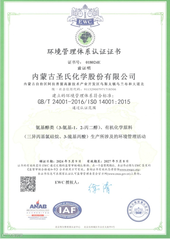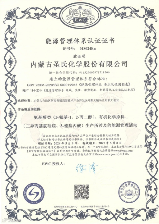 近日,内蒙古圣氏化学股份有限公司接受北京埃尔维质量认证中心专家组的现场审核,并顺利通过ISO14001环境管理体系、ISO50001能源管理体系认证。