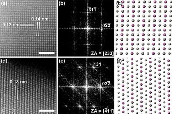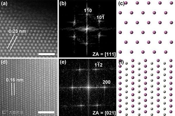 图3. Pd3In IMNCs在[-2-33] (a-c)和[-411] (d-f)方向的STEM图像、FFT图样和理想原子的结构模型。