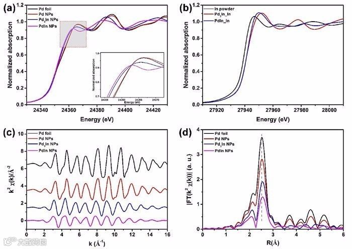 图4. (a) 钯边的X射线吸收近边结构谱图;(b) 铟边的X射线吸收近边结构谱图;(c) 钯边的k空间振荡函数;(d) 傅里叶变换后的R空间径向结构函数。