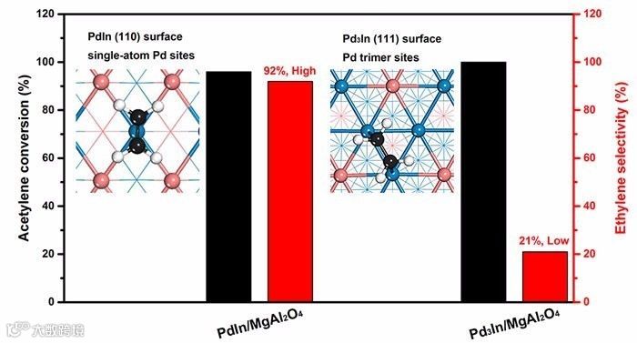 在利用密度泛函理论(density functional theory,DFT)模拟乙炔分子在PdIn和Pd3In IMCs表面可能的加氢反应路径基础上,作者发现金属间化合物(intermetallic compounds,IMCs)PdIn中Pd原子被In原子有效地完全隔离,而Pd3In中Pd原子被In原子部分隔离。考虑到空间排列效应和表面稳定性的影响,他们选取PdIn (110)和Pd3In (111)表面,研究了乙炔在这些表面的氢化反应机制。DFT计算结果表明,与具有三聚Pd活性位点的Pd3In (111)表面相比,具有单原子Pd活性位点的PdIn (110)表面在乙炔半氢化反应中表现出高乙烯选择性。