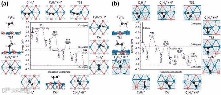 图1. (a) PdIn (110)和Pd3In (111)表面乙炔氢化生成乙烷的催化循环机理图。括号内的数值为基元反应的活化能,单位为eV。蓝色、橙色、黑色和白色的圆球分别代表Pd、In、C和H原子。