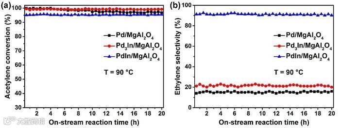图5. 三种催化剂样品的 (a) 乙炔转化率和 (b) 乙烯选择性与反应时间的关系曲线。
