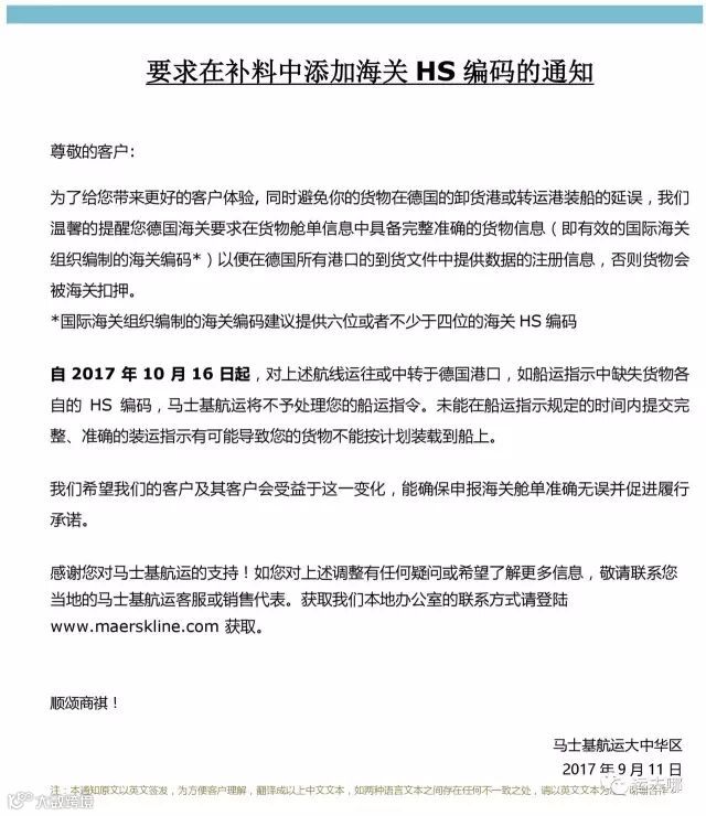 目前,马士基航运已率先发布通知。从10月16日起,要求出口到德国或者中转于德国港口的货必须提供货物各自的HS编码!如未能提供,将不予处理货主的船运指令!没有在规定时间内提交完整且准确的货运指示,货物就很有可能不能上船!