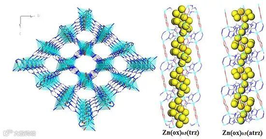 图1. Zn(ox)0.5(trz)的晶体结构和材料的瓶颈-空腔孔道