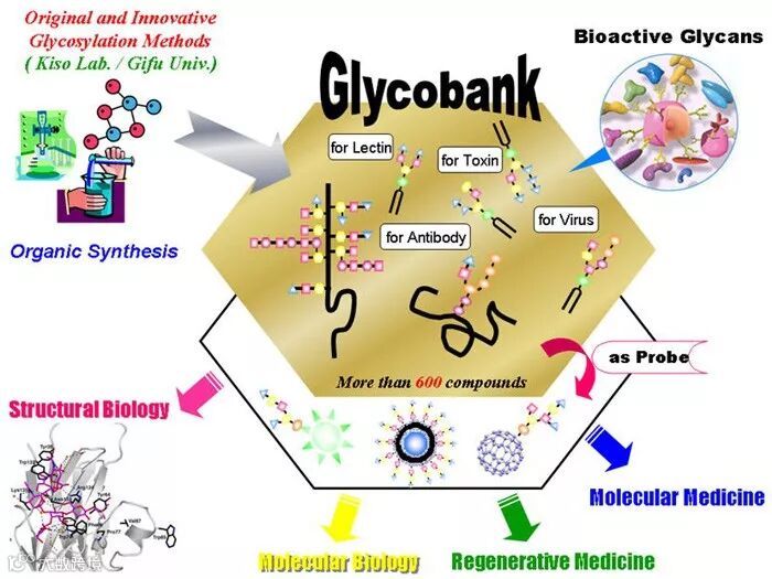 天然产物和有机合成是聚糖分子的主要来源,它们在结构生物学、分子生物学、再生医学、分子医学、分子探针等多个领域都扮演着重要角色。图片来源:Gifu Global Glyco-Lab at Gifu University [3]