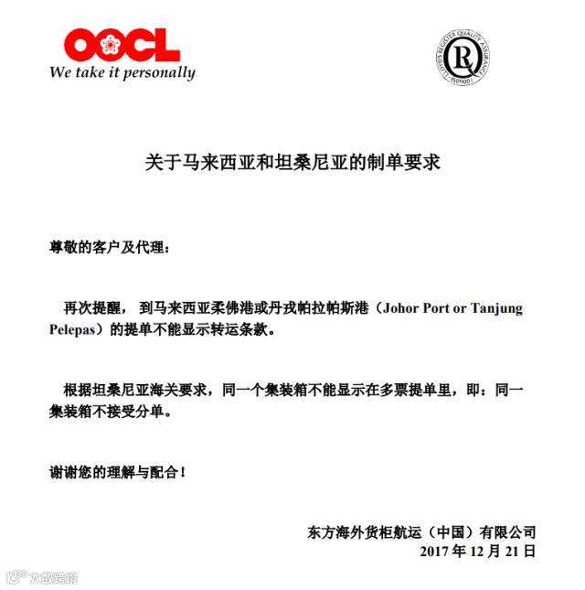 再次提醒, 到马来西亚柔佛港或丹戎帕拉帕斯港(Johor Port or Tanjung Pelepas)的提单不能显示转运条款。 根据坦桑尼亚海关要求,同一个集装箱不能显示在多票提单里,即:同一 集装箱不接受分单。