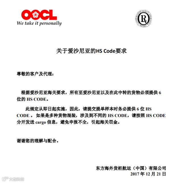 尊敬的客户及代理: 根据爱沙尼亚海关要求,所有至爱沙尼亚以及在此中转的货物必须提供 6 位的 HS CODE。 此规定从即日起实施,因此,请提交提单样本时务必提供 6 位 HS CODE 。 如果是多种货物混装,涉及到不同的 HS CODE,请按照 HS CODE 分开发送 cargo 信息,避免申报不全,引起海关罚金。