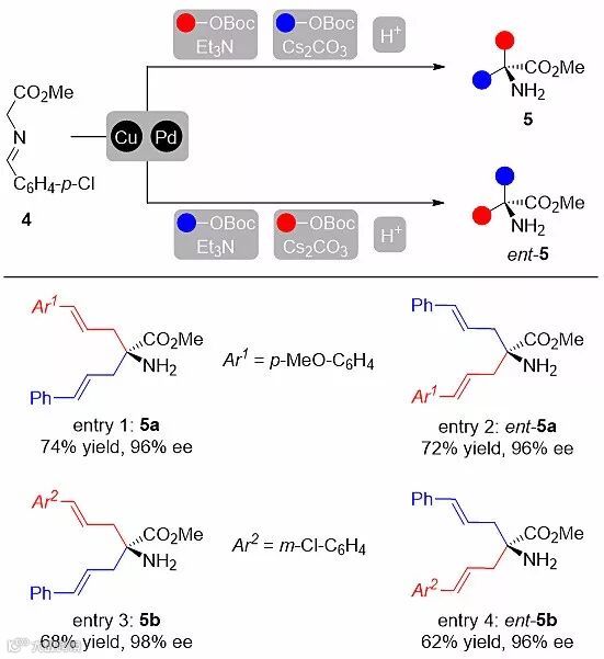 随后作者还尝试了将该催化体系应用于更具有挑战性的甘氨酸甲酯衍生席夫碱的双烯丙基化反应。相比于单烯丙基化反应,该设想存在多个难点:(1)反应的催化活性是否足以实现双烯丙基化;(2)如何避免可能产生的偕二烯丙基化产物;(3)催化剂能否识别两种烯丙基取代基之间的微小差别,从而实现反应的立体控制。经过对反应条件的仔细筛选后,作者成功通过两步一锅法实现了这一设想,第一步的烯丙基化反应选择碱性较弱的有机碱Et3N,可以有效避免不利的偕二烯丙基化反应历程,通过改变两种不同烯丙基碳酸酯的投料顺序,在同一条件下通过一锅法双烯丙基化反应可以得到目标产物的一对对映异构体。