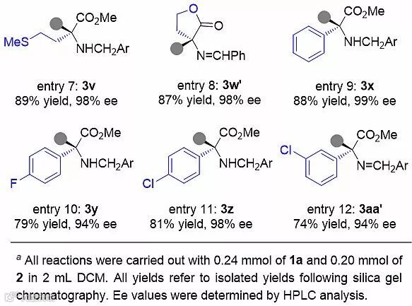 作者继续考察了席夫碱的底物适用性,多种天然、非天然氨基酸衍生的席夫碱在该催化体系下都能很好地参与反应,以优异的产率和对映选择性得到一系列α,α-双取代-α-氨基酸衍生物。